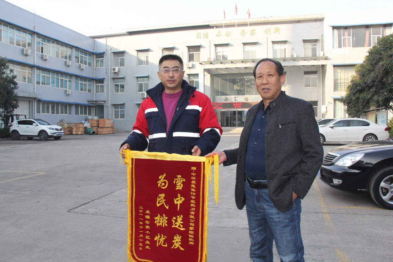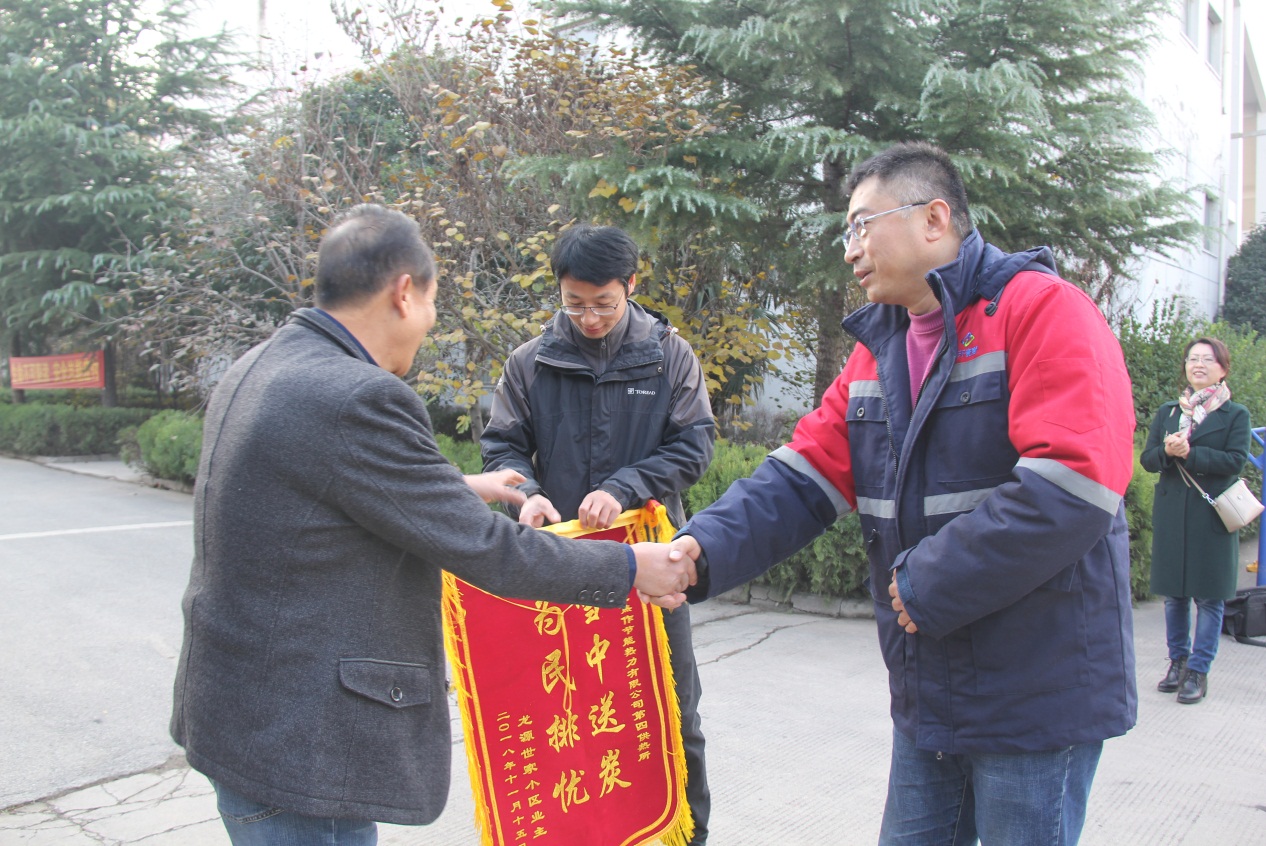 11月20日上午,龍?jiān)词兰倚^(qū)業(yè)主委員會(huì)與物業(yè)公司工作人員向熱力公司第四供熱所送來錦旗一面-----雪中送炭、為民排憂。事情的經(jīng)過是這樣的,龍?jiān)词兰倚^(qū)供暖已經(jīng)多年,跑冒滴漏情況較為嚴(yán)重,第四供熱所所長徐光面對(duì)該小區(qū)情況,為保證本采暖季能夠正常供暖,自上個(gè)采暖季結(jié)束后就對(duì)該小區(qū)重點(diǎn)關(guān)注,多次派現(xiàn)場(chǎng)工作人員進(jìn)行檢測(cè)、維修,對(duì)于出現(xiàn)的問題隨叫隨到,積極解決。尤其是1號(hào)樓、2號(hào)樓、3號(hào)樓的部分單元,經(jīng)過現(xiàn)場(chǎng)勘測(cè),綜合評(píng)定,決定將原來的地埋敷設(shè)改為架空敷設(shè),徹底解決部分單元的供暖不穩(wěn)定、經(jīng)常中斷的問題。今冬供暖后,該小區(qū)供暖平穩(wěn),用戶滿意,物業(yè)滿意。為了表達(dá)感激之情,特向熱力公司第四供熱所送來了錦旗一面,感謝熱力公司急民之所需,雪中送炭,為民排憂,為民服務(wù)。