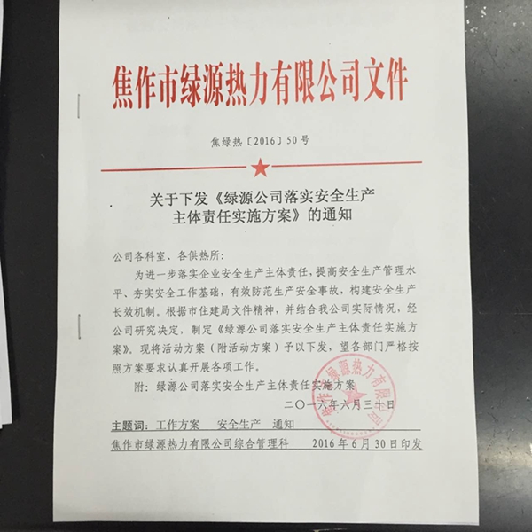 以《中華人民共和國安全生產(chǎn)法》、《河南省人民政府安全生產(chǎn)委員會關(guān)于強(qiáng)化和落實(shí)生產(chǎn)經(jīng)營單位安全生產(chǎn)主體責(zé)任的通知》(豫安委[2016]8號)、《中共市委人民政府關(guān)于加強(qiáng)安全生產(chǎn)工作的實(shí)施意見》(焦發(fā)【2014】11號)、《焦作市住房和城鄉(xiāng)建設(shè)局關(guān)于做好公用事業(yè)企業(yè)安全生產(chǎn)主體責(zé)任工作的通知》(焦建公【2016】11號)為行動準(zhǔn)則,牢固確立“安全第一、預(yù)防為主、綜合治理”的宗旨,強(qiáng)化企業(yè)安全生產(chǎn)主體責(zé)任意識,改善安全生產(chǎn)條件和環(huán)境,促進(jìn)企業(yè)更好更平穩(wěn)的發(fā)展。