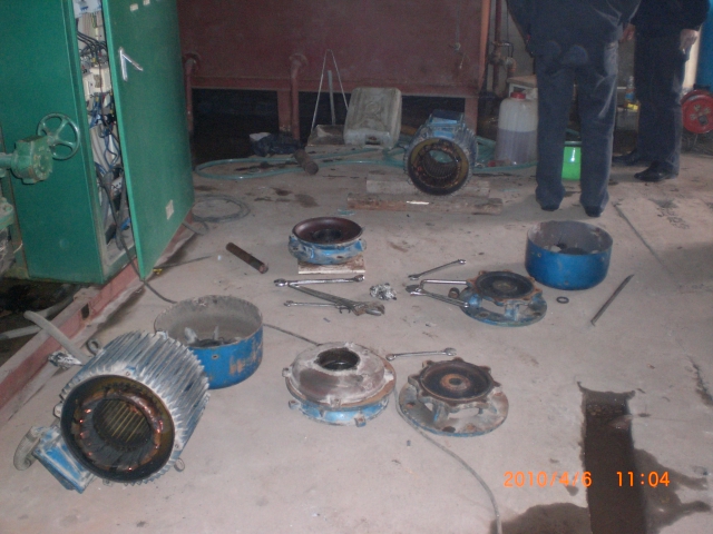 (3)對(duì)所有循環(huán)泵拆開,檢查水泵葉輪是否磨損,是否需更換;同時(shí)檢查水泵電機(jī)軸承,先清洗,然后判斷是否磨損,更換,最后再重新加黃油安裝;