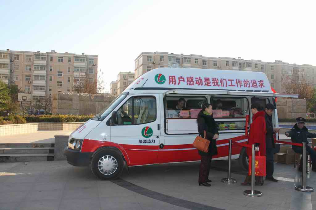 為了方面廣大用戶(hù)購(gòu)熱,為廣大居民提供更便捷的服務(wù),綠源熱力有限公司今年在服務(wù)工作中又推出了新舉措,投資近25萬(wàn)元購(gòu)置了流動(dòng)售賣(mài)服務(wù)車(chē),在采暖期到公司所屬的各小區(qū)開(kāi)展集中供熱售賣(mài)服務(wù)活動(dòng),讓各居民小區(qū)的居民可足不出戶(hù)就可購(gòu)熱,為廣大居民提供更加便捷的服務(wù)。