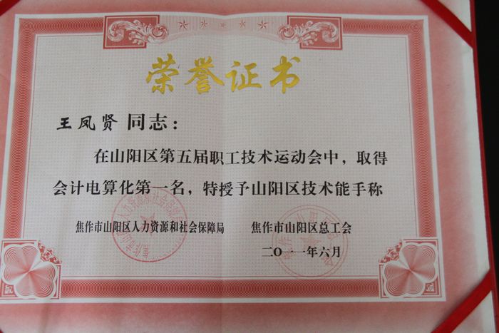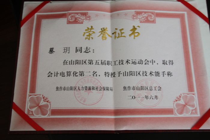 在山陽(yáng)區(qū)總工會(huì)、山陽(yáng)區(qū)人力資源和社會(huì)保障局聯(lián)合開(kāi)展的“山陽(yáng)區(qū)第五屆職工技術(shù)運(yùn)動(dòng)會(huì)”活動(dòng)中,我公司共參與10余名職工,經(jīng)過(guò)頑強(qiáng)拼搏,我公司職工王鳳賢、蔡玥兩位同志分獲會(huì)計(jì)電算化項(xiàng)目比賽的第一、二名,受到了山陽(yáng)區(qū)總工會(huì)的表彰。山陽(yáng)區(qū)總工會(huì)還為獲得第一名的王鳳賢同志頒發(fā)了山陽(yáng)區(qū)“五一勞動(dòng)獎(jiǎng)?wù)隆薄?/SPAN>